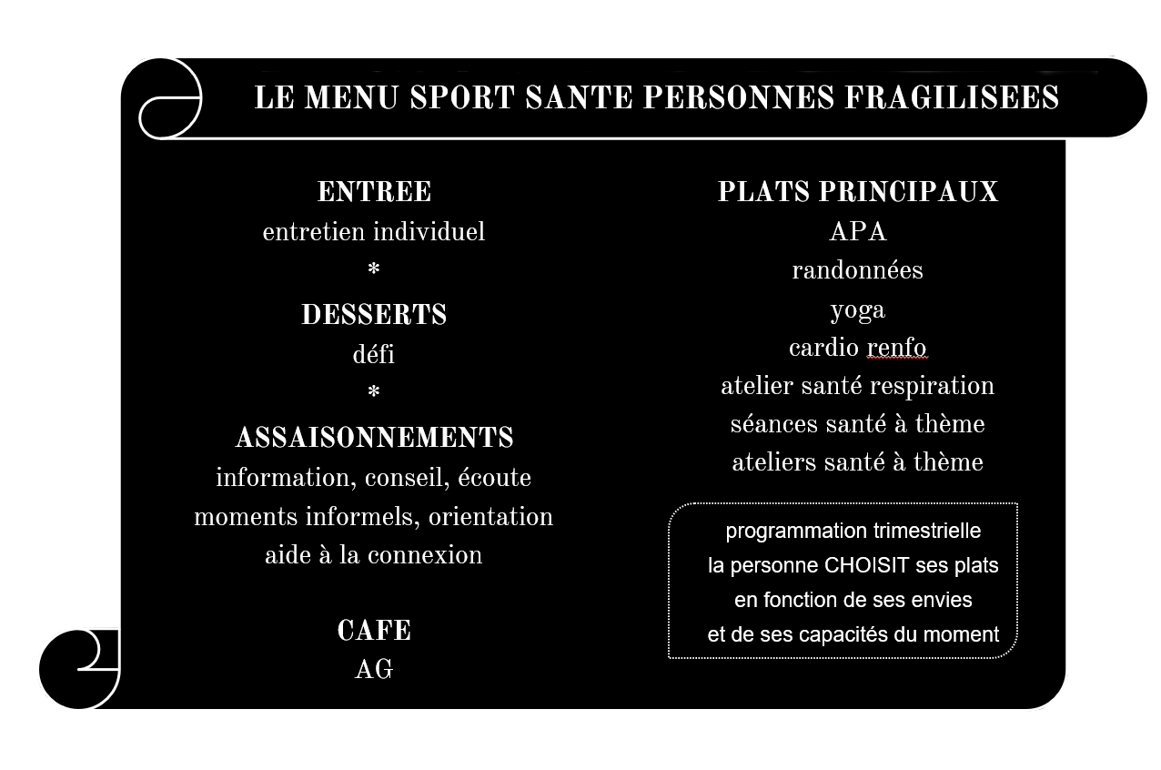 Le Menu Sport Santé Personnes fragilisées tient compte de la problématique suivante : la pratique agit favorablement sur la santé physique, mentale et sociale. Et pourtant, bouger, relève pour beaucoup de personnes, d'un réel défi, « à la hauteur de celui de gravir le toit du monde, l'Everest ». Les personnes éprouvent de grandes difficultés à s'engager dans une activité physique malgré le fait qu'elles aient conscience de l'importance de cette pratique pour leur santé : « L’angoisse éprouvée alimente l’idée d’incapacité à réussir ».
